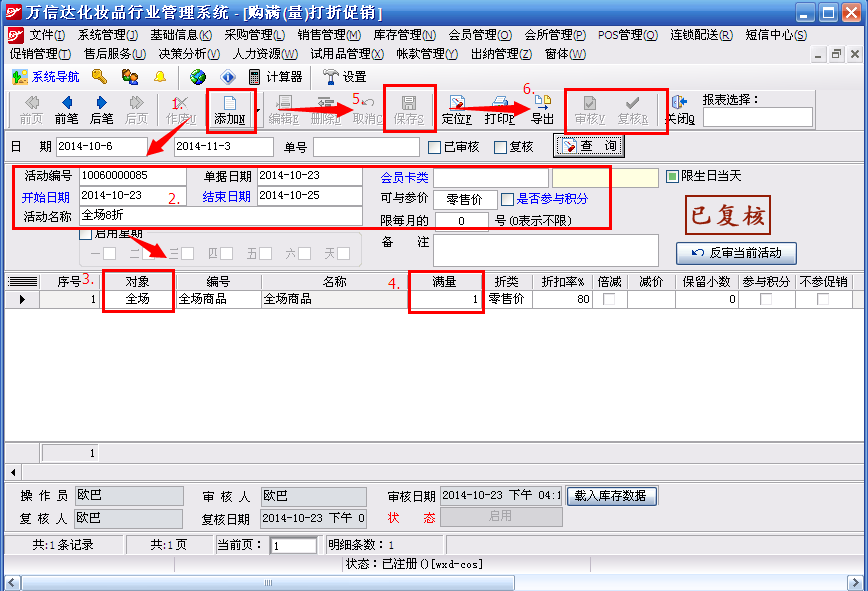 如何够满(量)促销,如上图:点击促销管理,进入够满(量)打折促销页面,选择添加,选择活动的开始日期和结束日期,输入活动名称。选择可参与参加如零售价就选择零售价实收价就选择实收价。选择完之后,填写对象,编号,名称。注意满量是指你活动需要买满多少量才可以参与活动,如果是买1瓶就可以参加活动,那么你满量上就填写1.输入折扣率,选择是否倍减,减价,保留几位小数,是否参与积分,不惨促销。然后点击保存。审核复核就可以生效了。