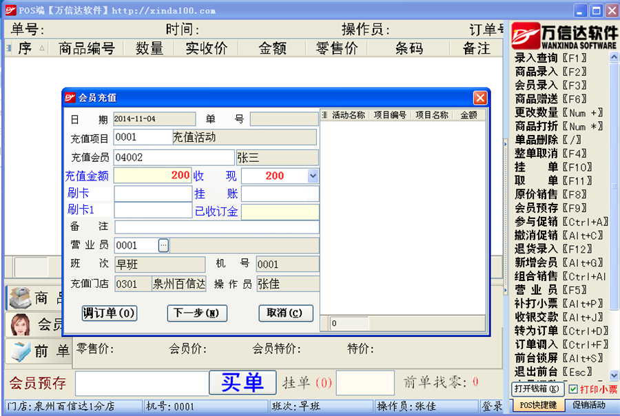 第一:打开->POS管理->POS端 ,进入POS前台,按F9或者直接点击前台的会员预存 ;